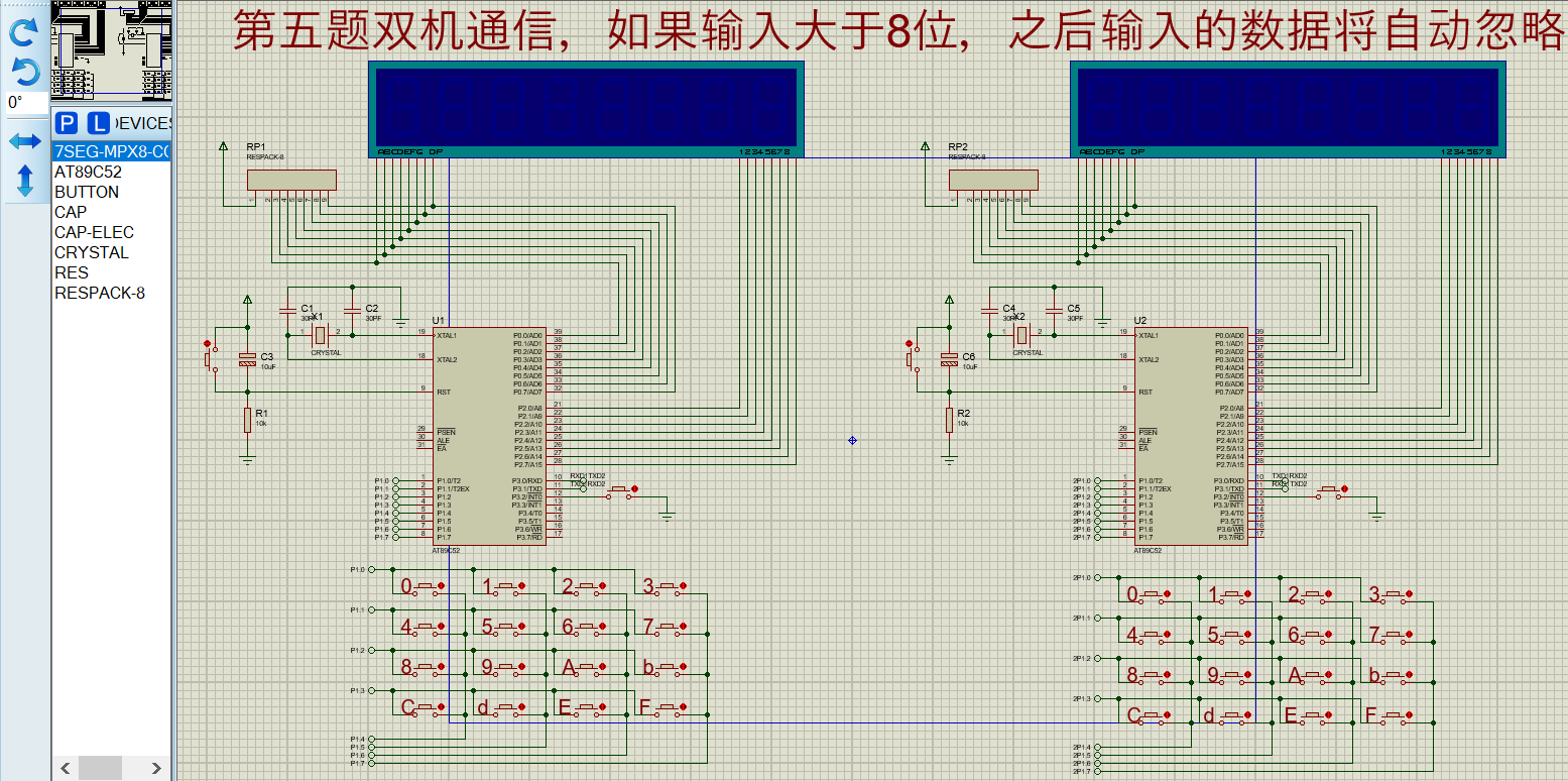 通过矩阵键盘,8位数码管,8255,74ls373等器件,完成单片机之间的串口通讯。将两个单片机的串行口连接,进行异步串行通讯。两个单片机能够通过按键,8位数码管,设置输出数据(10个数字和A-F字符组成的字符串,最多输入8个)和显示接收到的数据(最多8个),通过设置发送键(可使用外部中断),发送。 (100分)
