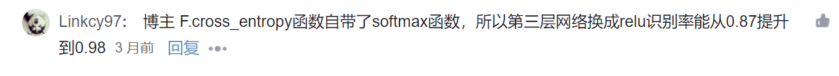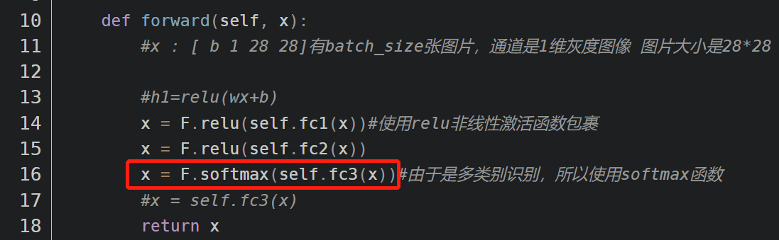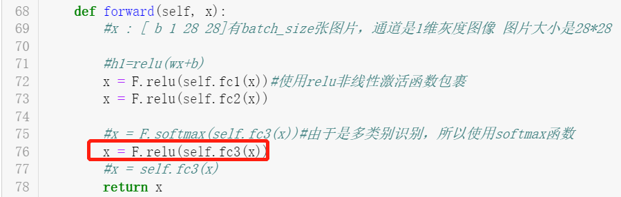可以把上图红框注释,如下图所示换成x = F.relu(self.fc3(x))