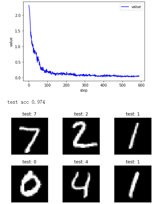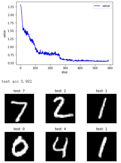 # https://blog.csdn.net/qq_42325947/article/details/108318673 # mnist import torch import torchvision import torch.nn as nn import torch.nn.functional as F from torch import optim from matplotlib import pyplot as plt def plot_curve(data): fig = plt.figure() plt.plot(range(len(data)), data, color='blue') plt.legend(['value'], loc='upper right') plt.xlabel('step') plt.ylabel('value') plt.show() def plot_image(img, label, name): fig = plt.figure() for i in range(6): plt.subplot(2, 3, i + 1) plt.tight_layout() plt.imshow(img[i][0] * 0.3081 + 0.1307, cmap='gray', interpolation='none') plt.title("{}: {}".format(name, label[i].item())) plt.xticks([]) plt.yticks([]) plt.show() # 加载数据集 batch_size = 512 train_loader = torch.utils.data.DataLoader( torchvision.datasets.MNIST('mnist_data', train=True, download=True, transform=torchvision.transforms.Compose( [ torchvision.transforms.ToTensor(), torchvision.transforms.Normalize((0.1307,), (0.3081,)) # 这里的两个数字分别是数据集的均值是0.1307,标准差是0.3081 ] ) ), batch_size=batch_size, shuffle=True ) test_loader = torch.utils.data.DataLoader( torchvision.datasets.MNIST('mnist_data/', train=False, download=True, # 是验证集所以train=False transform=torchvision.transforms.Compose( [ torchvision.transforms.ToTensor(), torchvision.transforms.Normalize((0.1307,), (0.3081,)) ] ) ), batch_size=batch_size, shuffle=False # 是验证集所以无需打乱,shuffle=False ) # 创建网络模型 class Net(nn.Module): def __init__(self): super(Net, self).__init__() #wx+b self.fc1 = nn.Linear(28*28,256)#256是自己根据经验随机设定的 self.fc2 = nn.Linear(256,64) self.fc3 = nn.Linear(64,10)#注意这里的10是最后识别的类别数(最后一层的输出往往是识别的类别数) def forward(self, x): #x : [ b 1 28 28]有batch_size张图片,通道是1维灰度图像 图片大小是28*28 #h1=relu(wx+b) x = F.relu(self.fc1(x))#使用relu非线性激活函数包裹 x = F.relu(self.fc2(x)) #x = F.softmax(self.fc3(x))#由于是多类别识别,所以使用softmax函数 x = F.relu(self.fc3(x)) #x = self.fc3(x) return x # 训练 net = Net() optimizer = optim.SGD(net.parameters(),lr=0.1,momentum=0.9) train_loss = [] for epoch in range(5): for batch_idx,(x,y) in enumerate(train_loader):#enumerate表示在数据前面加上序号组成元组,默认序号从0开始 # x :[512 1 28 28] y : [512] #由于这里的x维度为[512 1 28 28],但是在网络中第一层就是一个全连接层,维度只能是[b,feature(784)],所以要把x打平 #将前面多维度的tensor展平成一维 # 卷积或者池化之后的tensor的维度为(batchsize,channels,x,y),其中x.size(0) # 指batchsize的值,最后通过x.view(x.size(0), -1) # 将tensor的结构转换为了(batchsize, channels * x * y),即将(channels,x,y)拉直,然后就可以和fc层连接了 x = x.view(x.size(0),28*28) #输出之后的维度变为[512,10] out=net(x) #使用交叉熵损失 # loss = F.cross_entropy(out,y) # ************************************************************************************************************* # 使用LabelSmoothing LS = LabelSmoothing(smoothing=0.1) loss = LS(out, y) # ************************************************************************************************************* #清零梯度——计算梯度——更新梯度 #要进行梯度的清零 optimizer.zero_grad() loss.backward() #功能是: w` = w-lr*grad optimizer.step() train_loss.append(loss.item())#将loss保存在trainloss中,而loss.item()表示将tensor 的类型转换为数值类型 #打印loss if batch_idx % 10 == 0: print(epoch,batch_idx,loss.item()) # 验证 plot_curve(train_loss) total_correct = 0 for x, y in test_loader: x = x.view(x.size(0),28*28) out = net(x) #out :[512,10] pred = out.argmax(dim = 1) correct = pred.eq(y).sum().float().item()#当前批次识别对的个数 total_correct+= correct total_number = len(test_loader.dataset) acc = total_correct / total_number print('test acc',acc) x,y = next(iter(test_loader)) out = net(x.view(x.size(0),28*28)) pred = out.argmax(dim=1) plot_image(x,pred,'test')