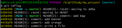 现在,你回退到了某个版本,关掉了电脑,第二天早上就后悔了,想恢复到新版本怎么办?找不到新版本的commit id怎么办?