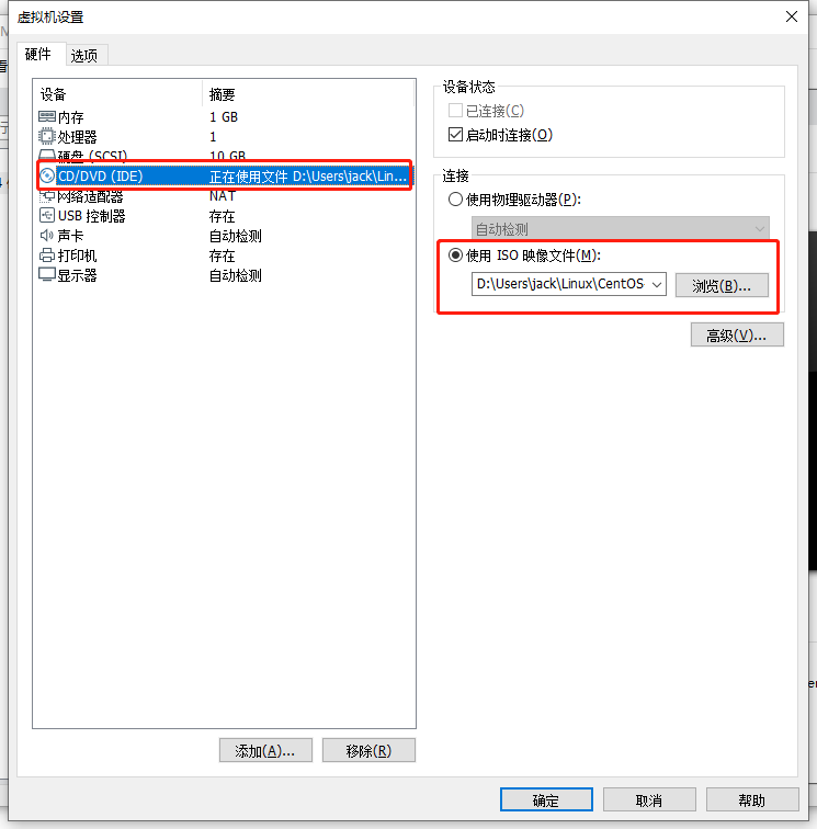 菜单栏 =》设置 =》CD/DVD(IDE) =》使用 ISO 镜像文件 =》选择 ISO 文件路径 =》确定。