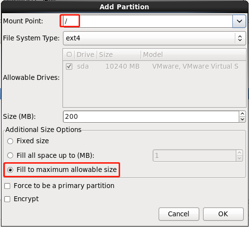 boot:安装内核及引导程序,200M基本足够,选择作为主分区,然后OK。