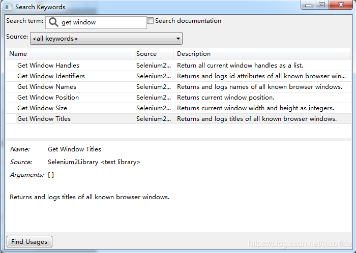 Select Window:选择浏览器窗口匹配定位器。如果找到该窗口,所有后续命令都将使用所选窗口,直到再次使用该关键字。如果没有找到窗口,则此关键字将失败。返回前一个窗口句柄,并可用于稍后返回该句柄。