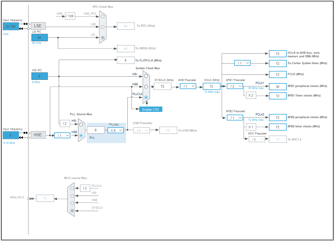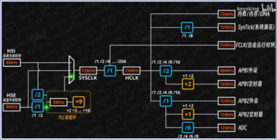 - 整个系统的核心时钟源,所有其他时钟(HCLK、APB1/APB2等)均由其分频或直接派生。