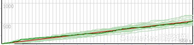 (模拟500次后的收入产出图,红色为投入、绿色为产出)