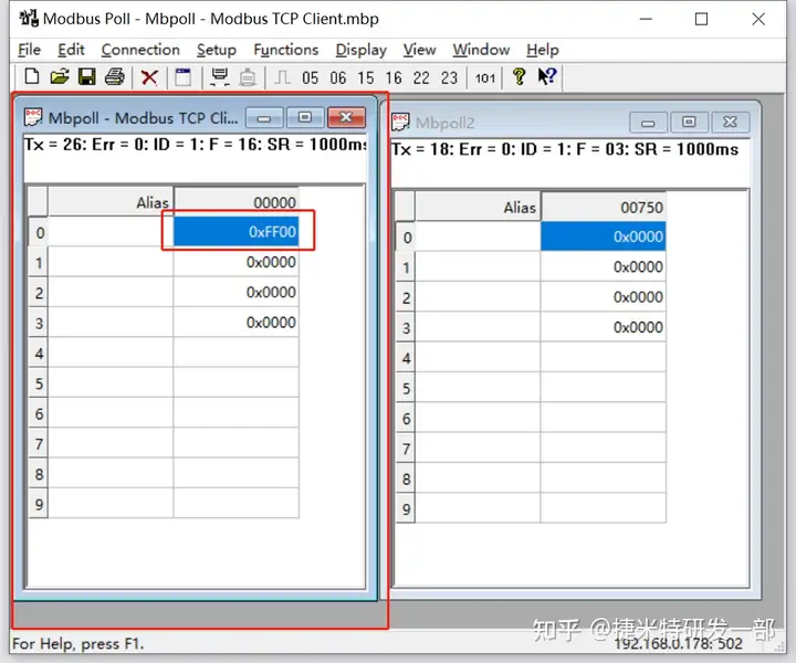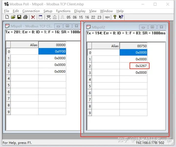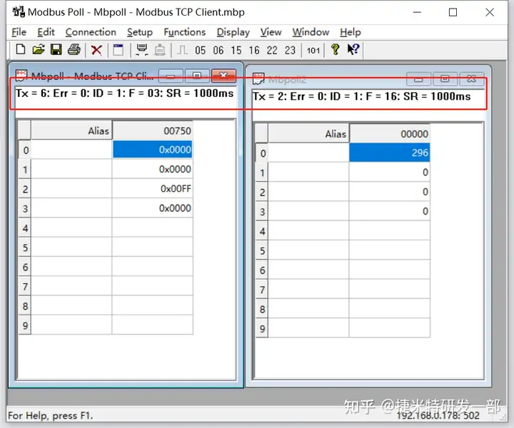 - MODBUS TCP侧Modbus Poll软件在线观察,所有命令界面无报错信息显示,Err指示数字不变化则通讯正常,如图所示:
