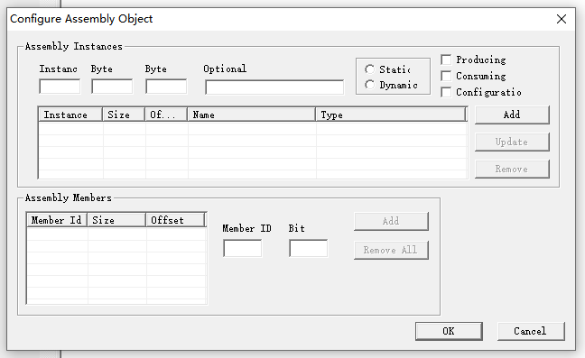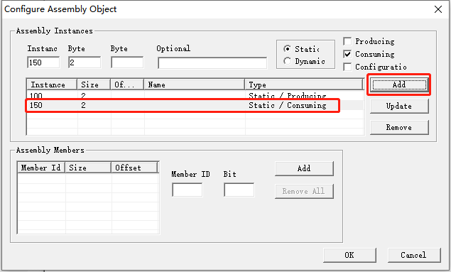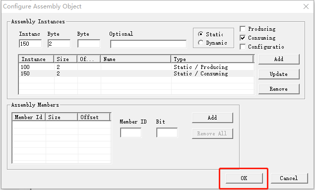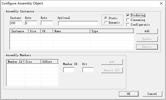 首先添加EIP从站对网关主站输出数据长度,在“Instance”栏写入值“100”、在第一格“Byte”栏写入配置数据长度“2”、勾选“static”以及“Producing”选项,如图所示: