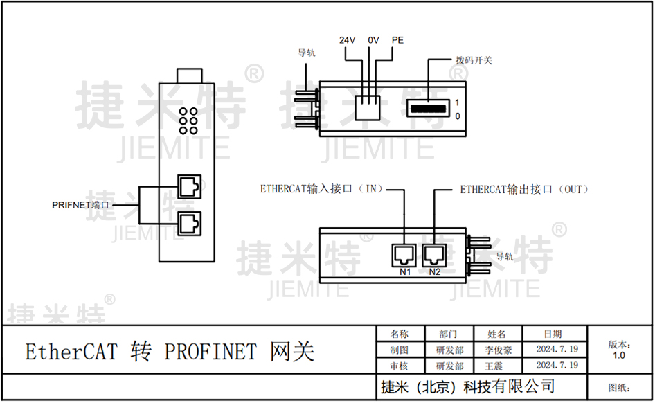 连接与配置:将捷米特JM-ECAT-PN网关的Ethercat端口与倍福PLC相连,作为Ethercat从站接收倍福PLC发送的关于光伏设备的运行数据。网关的Profinet端口与西门子 PLC 连接,作为Profinet从站将数据传输给西门子PLC。在西门子PLC的Profinet配置软件中添加网关设备,设置网关的IP地址、设备名称等参数,并配置输入输出数据长度,以确定从倍福PLC接收的数据范围和格式。在倍福PLC的Ethercat配置环境中,设置网关的Ethercat从站参数,如站地址等,使网关与倍福PLC建立通信连接。以下为具体配置方法: