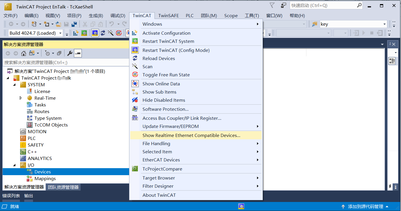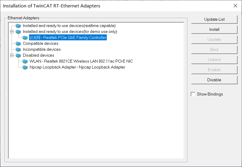 在TC3内安装EtherCAT主站网卡驱动,点击主菜单栏“TwinCAT”下的“Show Realtime Ethernet Compatible Devices…”,选择本机网卡,点击“Install”