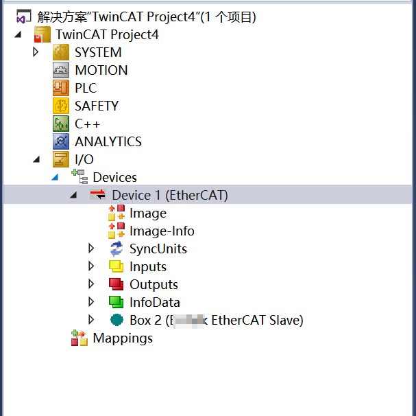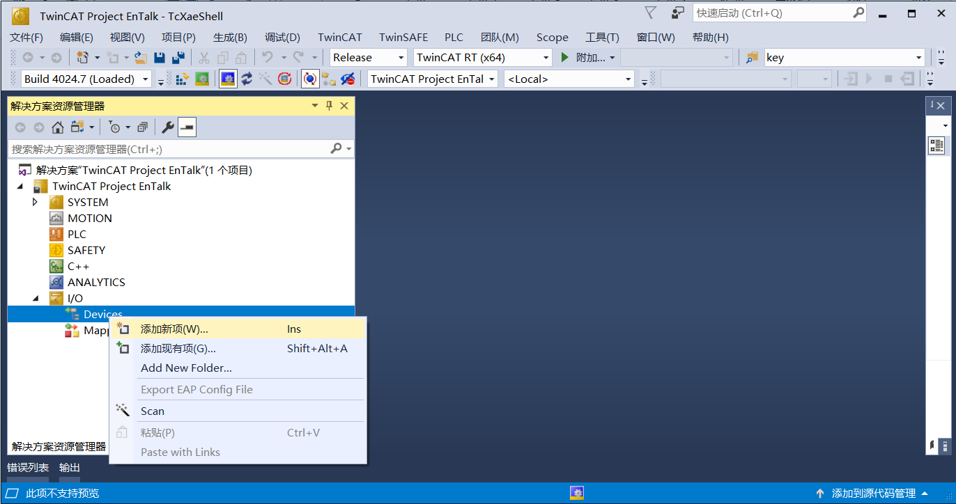 在上图中“I/O”展开“Devices”的位置,点击鼠标右键选择“Scan”扫描连接的从站或者选中“Devices”后点击扫描按钮“