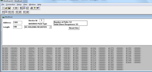 在子窗口“ModSca1”中设置DeviceID为PLC的站地址(如1),功能号选择03:HOLDINGREGISTER,Address=1301,Length=100。