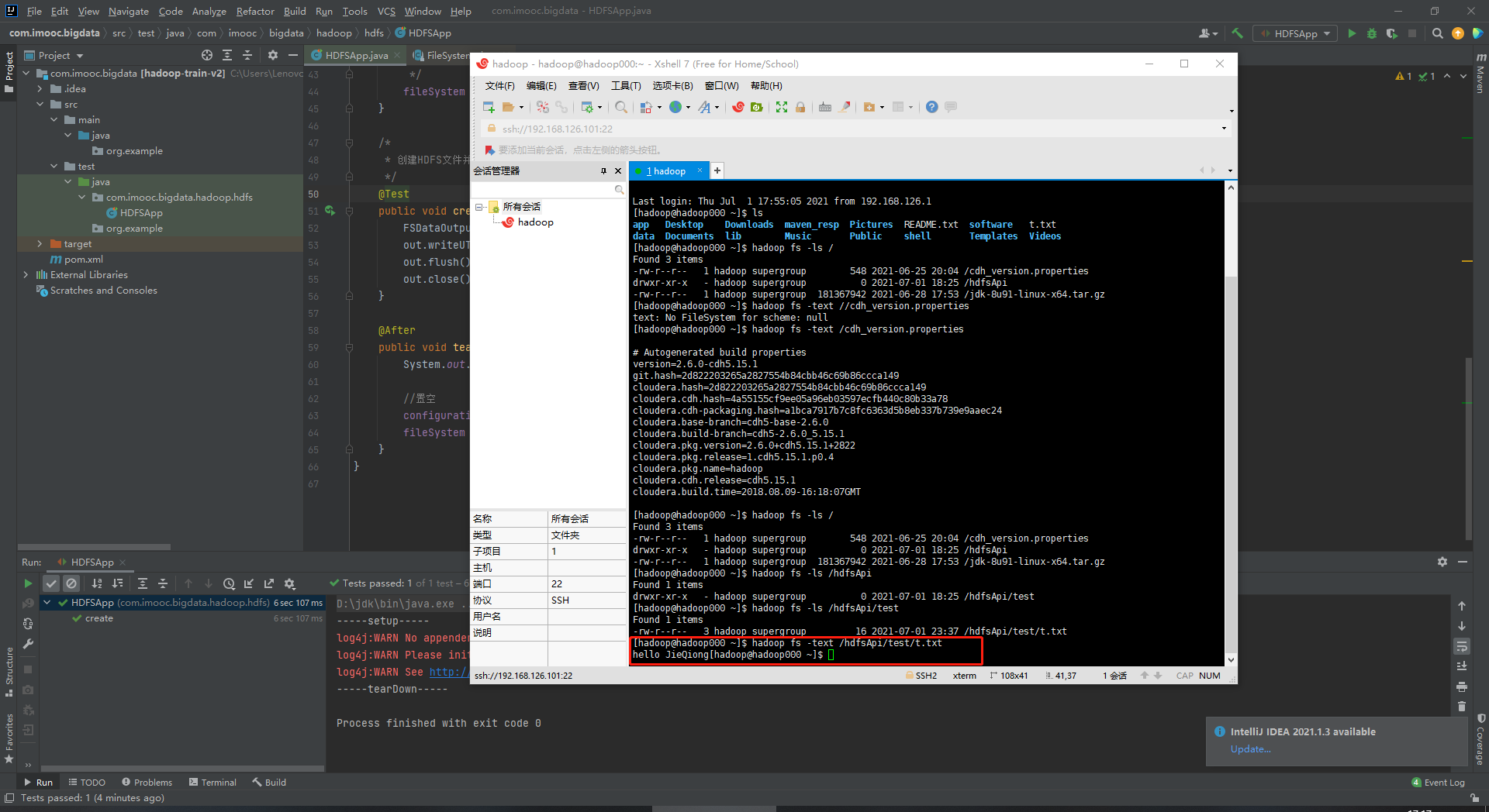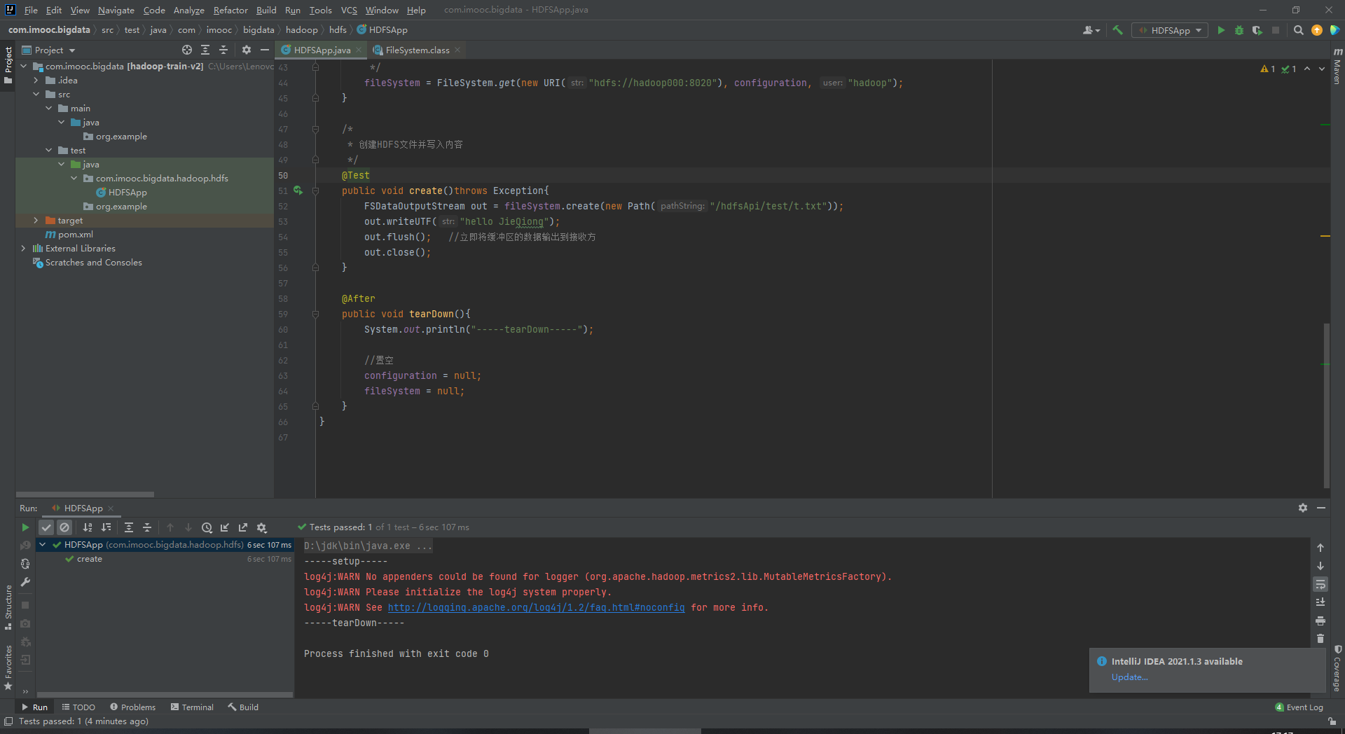 52 FSDataOutputStream out = fileSystem.create(new Path("/hdfsApi/test/t.txt"));