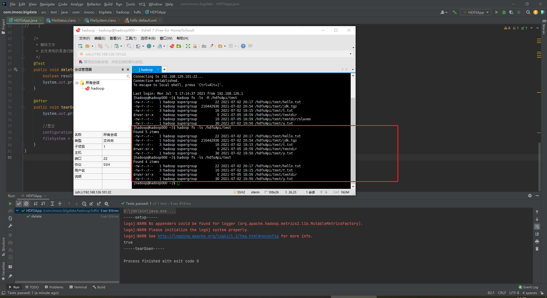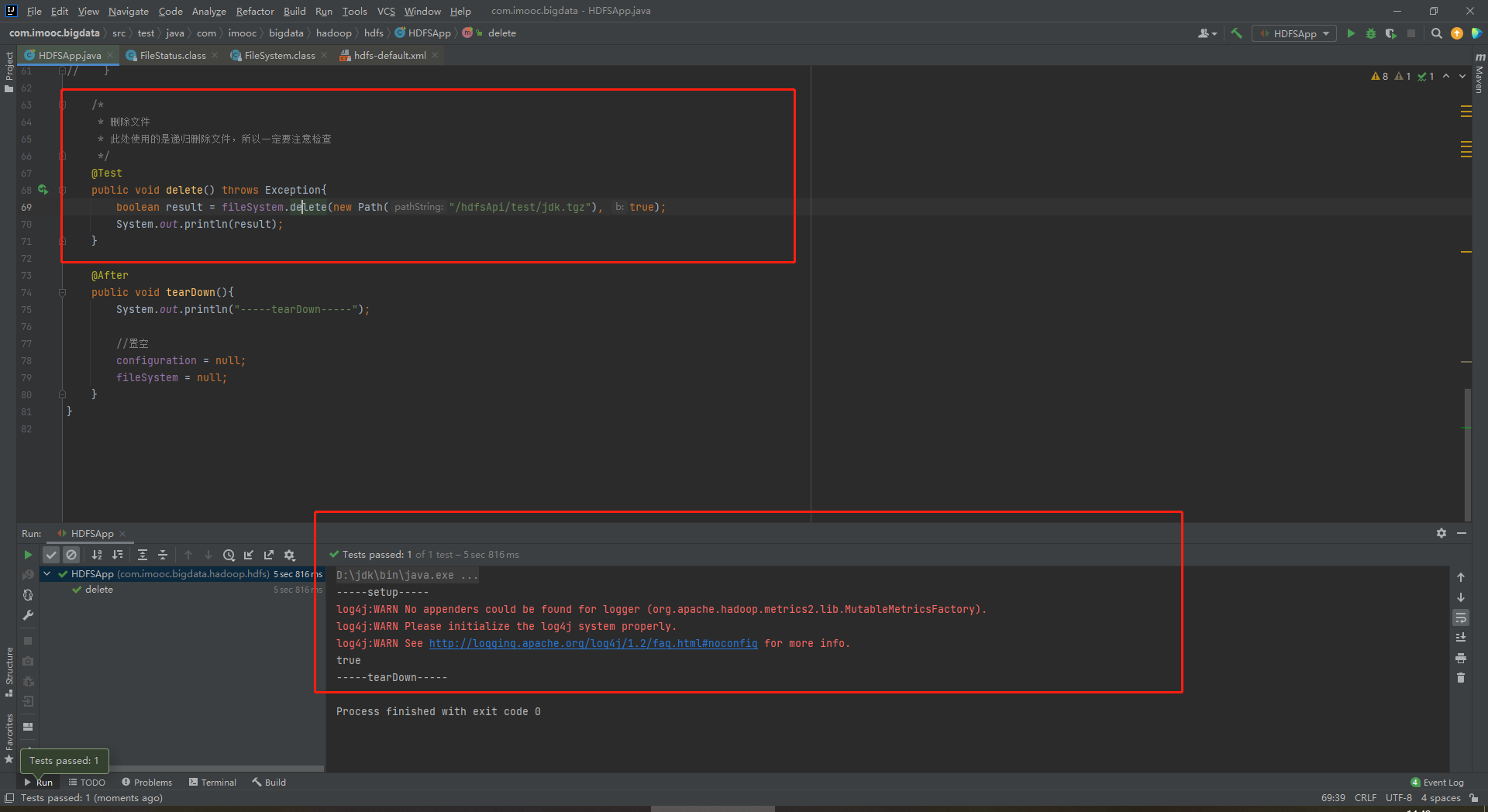 boolean result = fileSystem.delete(new Path("/hdfsApi/test/jdk.tgz"), true);