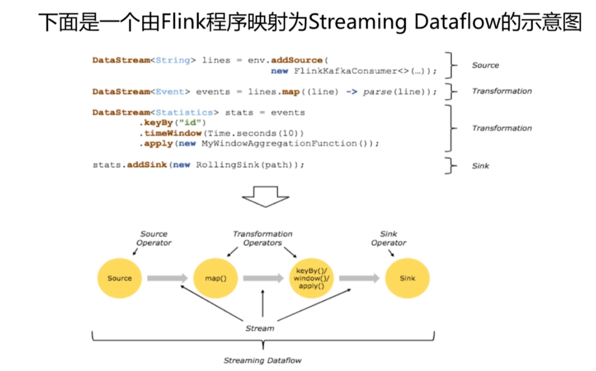 - Flink程序的基础构建模块是流Stream(指输入) 和转换Transformations(对输入的数据进行操作,比如map操作、reduce操作)。