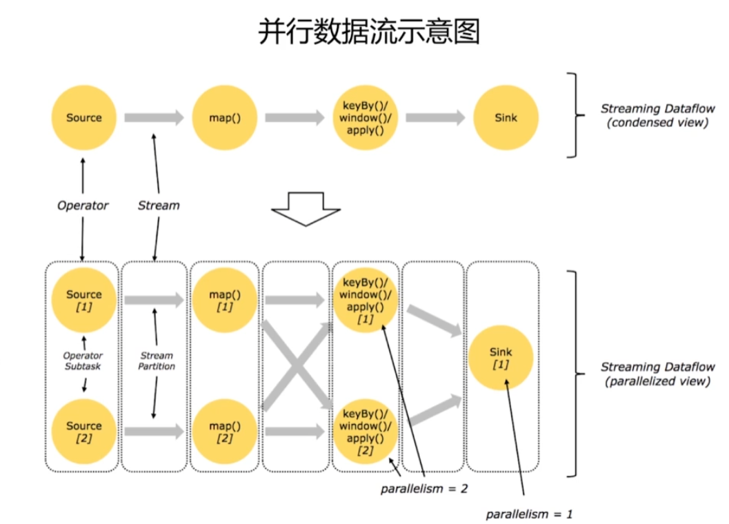 - source可以进行分区,将一个source分成多个子任务。对每一个子任务进行map。map后是一个shuffling的过程,然后根据key进行聚合、窗口操作等。