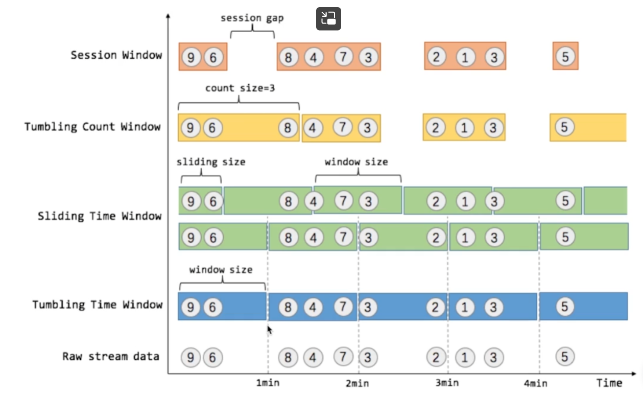- sliding time window 滑动时间窗口:需要指定一个sliding size。会出现同一个数字会属于上一个窗口,也会属于下一个窗口,会出现数据的重复。