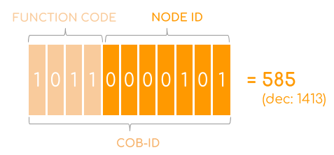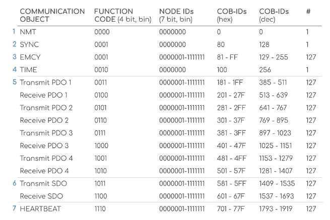 COB-ID其实就是11位CAN ID,它分两部分组成,高4位为功能码,低7位为从设备地址码,所以最多支持127个从设备。