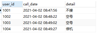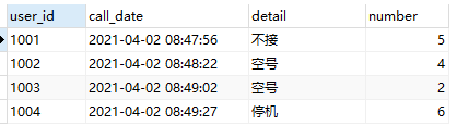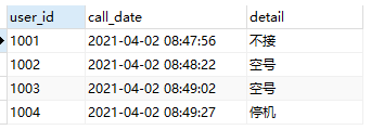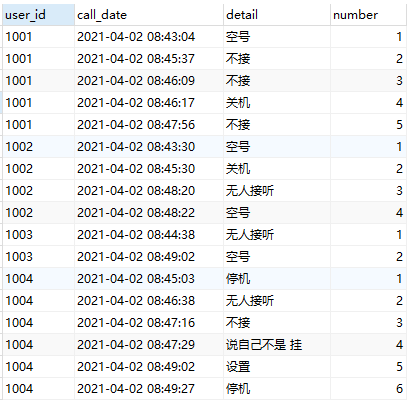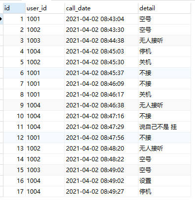 -- 创建测试表 CREATE TABLE `call_record` ( `id` int NOT NULL AUTO_INCREMENT COMMENT '流水ID', `user_id` varchar(20) CHARACTER SET utf8 COLLATE utf8_general_ci DEFAULT NULL COMMENT '操作员ID', `call_date` timestamp NULL DEFAULT NULL COMMENT '通话时间', `detail` varchar(255) CHARACTER SET utf8 COLLATE utf8_general_ci DEFAULT NULL COMMENT '详情记录', PRIMARY KEY (`id`) ) ENGINE=InnoDB AUTO_INCREMENT=0 DEFAULT CHARSET=utf8; -- 插入测试数据 INSERT INTO `call_record`(`id`, `user_id`, `call_date`, `detail`) VALUES (1, '1001', '2021-04-02 08:43:04', '空号'); INSERT INTO `call_record`(`id`, `user_id`, `call_date`, `detail`) VALUES (2, '1002', '2021-04-02 08:43:30', '空号'); INSERT INTO `call_record`(`id`, `user_id`, `call_date`, `detail`) VALUES (3, '1003', '2021-04-02 08:44:38', '无人接听'); INSERT INTO `call_record`(`id`, `user_id`, `call_date`, `detail`) VALUES (4, '1004', '2021-04-02 08:45:03', '停机'); INSERT INTO `call_record`(`id`, `user_id`, `call_date`, `detail`) VALUES (5, '1002', '2021-04-02 08:45:30', '关机'); INSERT INTO `call_record`(`id`, `user_id`, `call_date`, `detail`) VALUES (6, '1001', '2021-04-02 08:45:37', '不接'); INSERT INTO `call_record`(`id`, `user_id`, `call_date`, `detail`) VALUES (7, '1001', '2021-04-02 08:46:09', '不接'); INSERT INTO `call_record`(`id`, `user_id`, `call_date`, `detail`) VALUES (8, '1001', '2021-04-02 08:46:17', '关机'); INSERT INTO `call_record`(`id`, `user_id`, `call_date`, `detail`) VALUES (9, '1004', '2021-04-02 08:46:38', '无人接听'); INSERT INTO `call_record`(`id`, `user_id`, `call_date`, `detail`) VALUES (10, '1004', '2021-04-02 08:47:16', '不接'); INSERT INTO `call_record`(`id`, `user_id`, `call_date`, `detail`) VALUES (11, '1004', '2021-04-02 08:47:29', '说自己不是 挂'); INSERT INTO `call_record`(`id`, `user_id`, `call_date`, `detail`) VALUES (12, '1001', '2021-04-02 08:47:56', '不接'); INSERT INTO `call_record`(`id`, `user_id`, `call_date`, `detail`) VALUES (13, '1002', '2021-04-02 08:48:20', '无人接听'); INSERT INTO `call_record`(`id`, `user_id`, `call_date`, `detail`) VALUES (14, '1002', '2021-04-02 08:48:22', '空号'); INSERT INTO `call_record`(`id`, `user_id`, `call_date`, `detail`) VALUES (15, '1003', '2021-04-02 08:49:02', '空号'); INSERT INTO `call_record`(`id`, `user_id`, `call_date`, `detail`) VALUES (16, '1004', '2021-04-02 08:49:02', '设置'); INSERT INTO `call_record`(`id`, `user_id`, `call_date`, `detail`) VALUES (17, '1004', '2021-04-02 08:49:27', '停机');