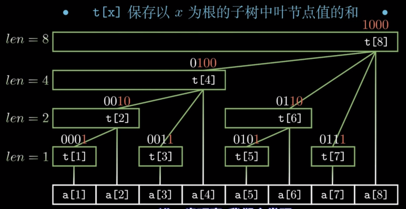 - t[x]节点的父节点为t[x+lowbit[x]]