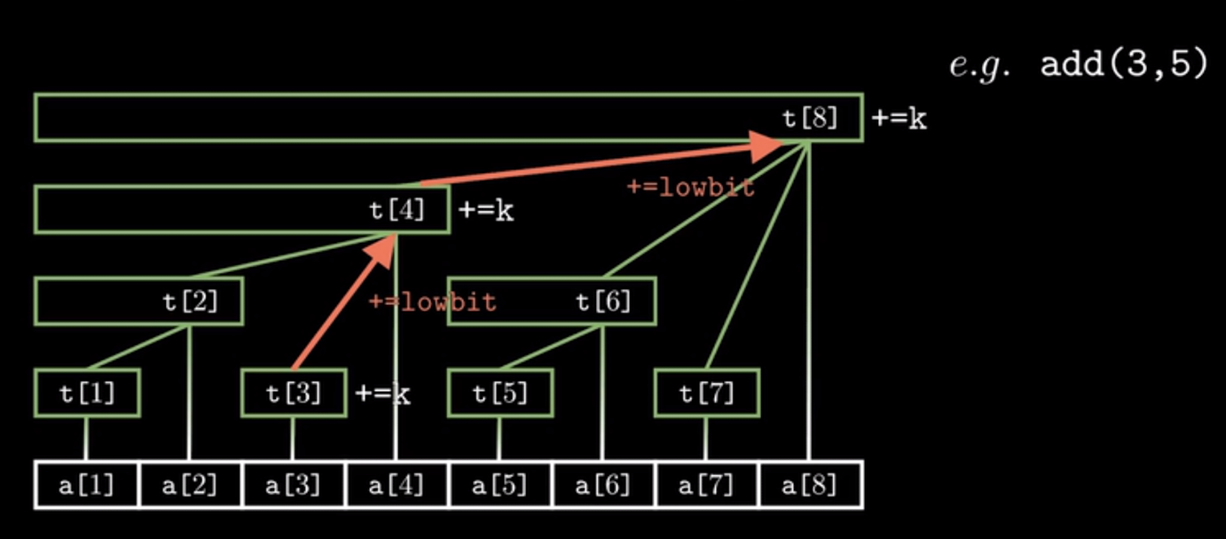 void add(int x,int k){ for(;x<=n;x+=lowbit(x)) t[x]+=k; }