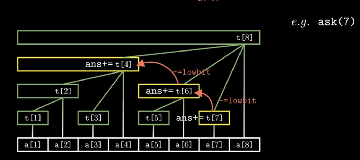 int ask(int x){ int ans=0; for(;x;x-=lowbit(x)) ans+=t[x]; return x; }