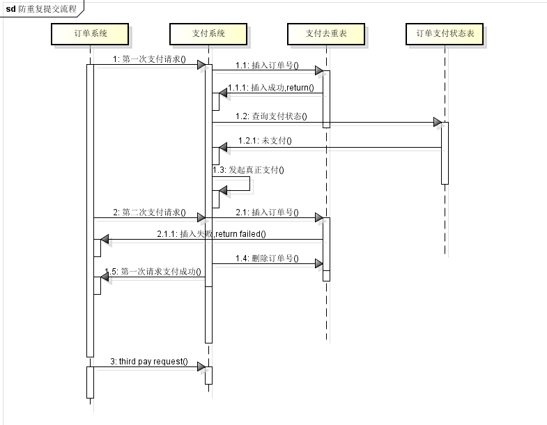 使用订单号orderNo做为去重表的唯一索引,每次请求都根据订单号向去重表中插入一条数据。第一次请求查询订单支付状态,当然订单没有支付,进行支付操作,无论成功与否,执行完后更新订单状态为成功或失败,删除去重表中的数据。后续的订单因为表中唯一索引而插入失败,则返回操作失败,直到第一次的请求完成(成功或失败)。可以看出防重表作用是加锁的功能。