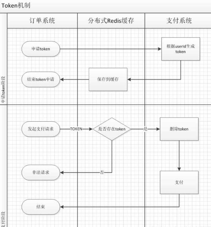 第二阶段,订单系统拿着申请到的token发起支付请求,支付系统会检查Redis中是否存在该token,如果存在,表示第一次发起支付请求,删除缓存中token后开始支付逻辑处理;如果缓存中不存在,表示非法请求。