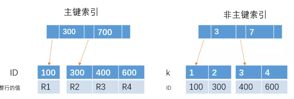 我们都知道,InnoDB引擎下的存储结构为b+树,也就是说首先根据key值一层一层的组织整个存储结构,然后在最后一层叶子节点存放真正的value值。那么我们用什么作为这个key值呢?主键索引就是将主键作为这个key值,非主键索引就是在建立索引时将其他值作为key。然后将主键作为value存储。非主键索引也被称为二级索引,而主键索引也被称为聚簇索引。
