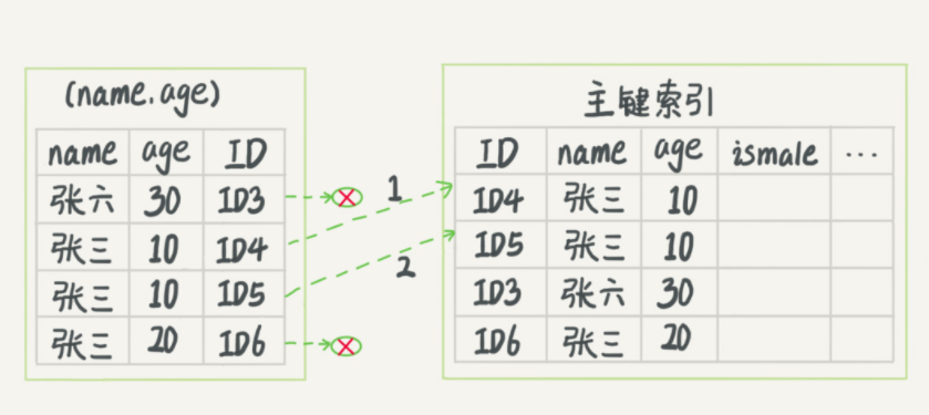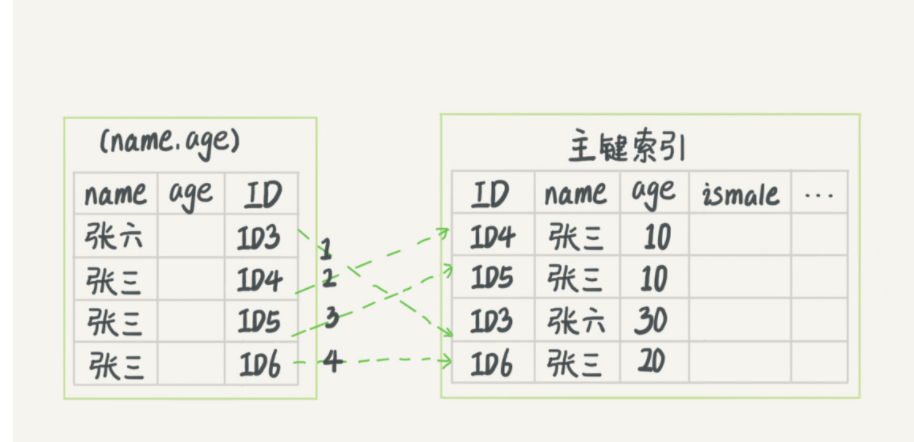 mysql建立索引的时候都是按照定义字段从左到右排序的。也就是说,如果存在索引(name,age)。最后建立的b+树的叶子节点肯定是从左到右先按照name属性分成n组。然后每组中再按照age属性排列的。所以当我们查询where name = XXX时,mysql就会使用上面的索引结构进行查询。而不是走全表扫描。但是如果是 where age = XXX 则不满足全局扫面。只能走全表扫描。
