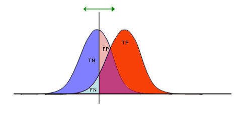 横坐标是身高,两个高斯代表男人和女人,通常来讲男人比女人高,但是这不是绝对的,中间这条线就是阈值。