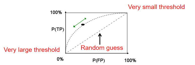 如果说阈值设置的特别小,比如设置为一米,宏观上所有男人身高都会超过一米,所以所有男人都会被预测为男人,即TP为100%,但是所有女人也会被预测为男人,即FN为100%,对应右上角那个点;