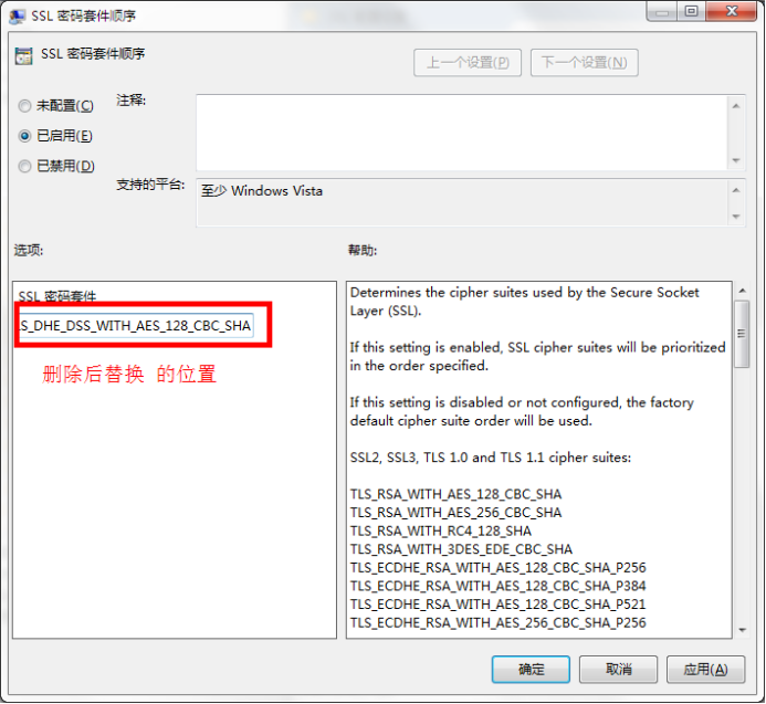 8、将原有字符删除后 将 下列字符替换到SSL密码套件的输入框中