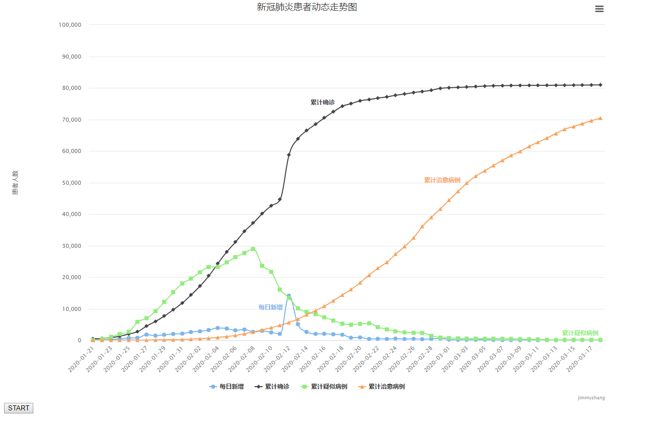 看了这个博文和对应的API文档,初步学习了flask+Highcharts的使用,大部分引用该博文内容,实现新冠肺炎趋势图表!先上图(动态图不会录制,直接拿最后结果):