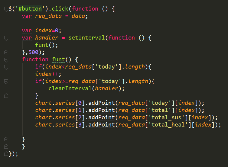 在按钮 button 上绑定了 click 事件,在事件中,我们根据后台数据的长度来决定新增数据点的数量。这样,每隔500毫秒,就会新增一个数据点,从而得到动态曲线图的效果