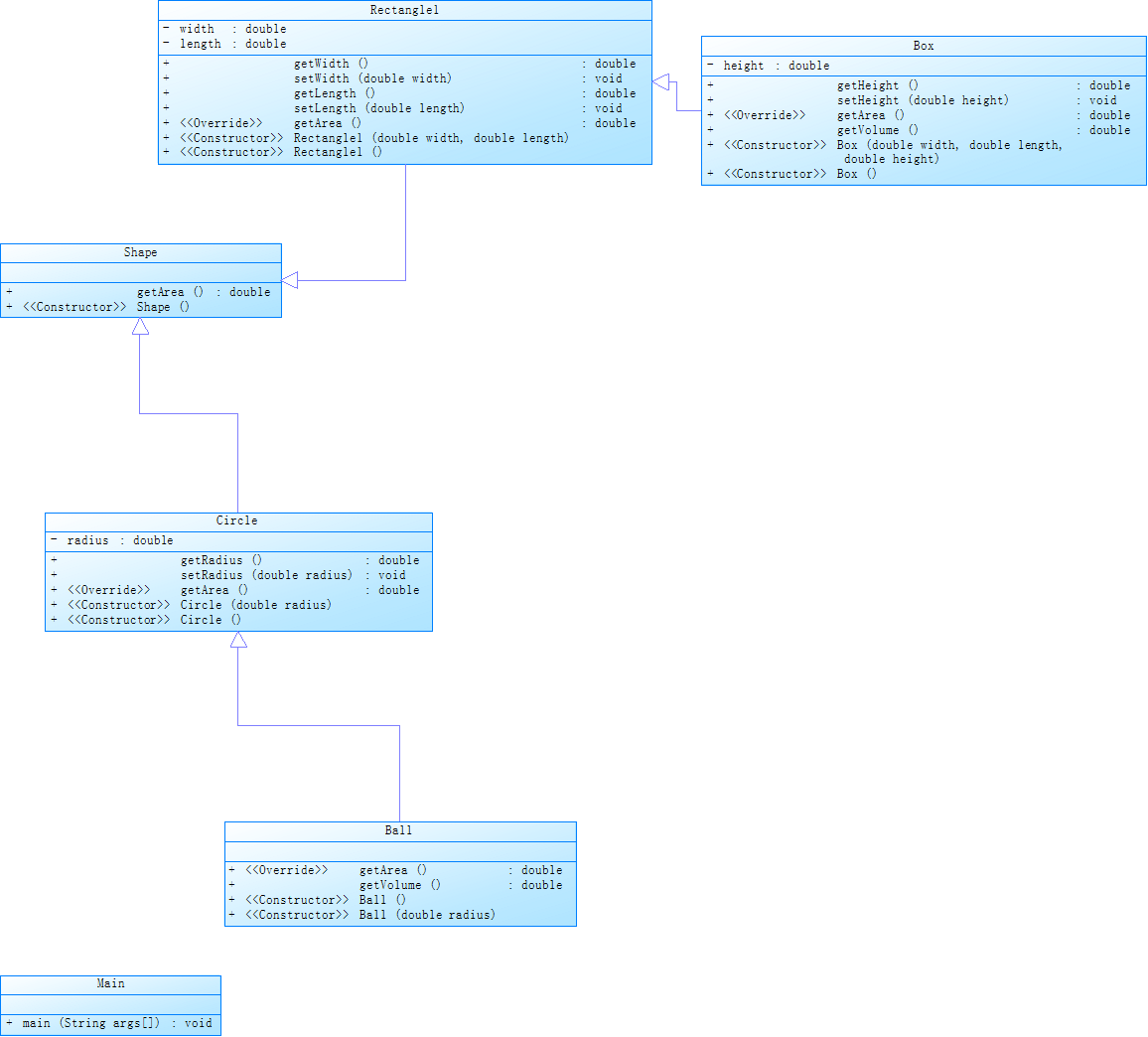 这三道题都是继承类题目,题目集4的7-3是要求我们求面积,几何体的表面积和体积,这道题的目的应该是让我们做了之后,更加熟练的运用Java中的继承这一大特点,首先第一题有一个总的Shape类,它是父类,它里面可以包括很多的类别,比如圆、矩形等等,它的子类包含了一个Circle类和Rectangle类,Shape类有一个getArea的方法,然后在Circle和Rectangle类中重写了求面积的方法,在这个基础上,又写了两个类Ball和Box分别继承了Circle类和Rectangle类,Ball类和Box类中又重写了求面积的方法,又增加了求体积的方法,每个类中都会输出自己的类名,就是一旦跟这个类有关就会输出这个类的类名;子类可以调用父类的方法,所以从而可以简单的实现共有的一些功能,或者说几个类当中有共同的方法或者属性,达到一定的数量之后,我们可以考虑使用父类和子类的关系,即继承的这个特点去加以实现;这样的话可以减少代码量,如果子类的计算方法和父类不一样,还可以重写其方法来达到目的,继承是Java中很重要的一个内容,我们想实现一些东西,在不改变自身代码的情况下,我们可以给之前的代码加一个父类。