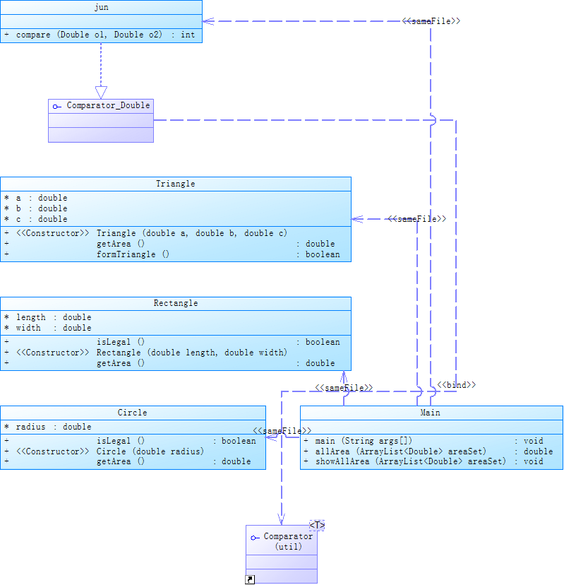 第二题也是要求我们求图形的面积,根据图形面积对图形对象进行排序并输出,第二题,这道题采用了抽象类定义,实体类构建的一个方式,我们首先有一个Shape类,但这个类与上一题不同的是,这是一个抽象类,拥有抽象的方法,求面积和数据校验,然后它有三个子类分别是,circle类rectangle类和triangle类分别,三个类继承于shape类,重写了求面积和数据校验的方法,我在主函数中分别创建三个类的对象然后将他们放入shape类型的list中,求面积的时候直接调用shape的getArea的方法就可以了,然后再根据面积对list中的对象排序,最后再输出面积。我认为这道题主要是想让我们更深刻的理解继承以及去理解多态,我们求面积只需要调用shape的求面积方法,就可以直接求面积,不需要调用谁谁的求面积去求谁谁的面积,这样的话,可以减少一个建立对象的次数,如果建立对象太多的话,那么使用多态可以避免这种现象的发生,与此同时,我们也可以减少内存的使用,这就是多态的好处,继承和多态提高了代码的可维护性和可延展性。