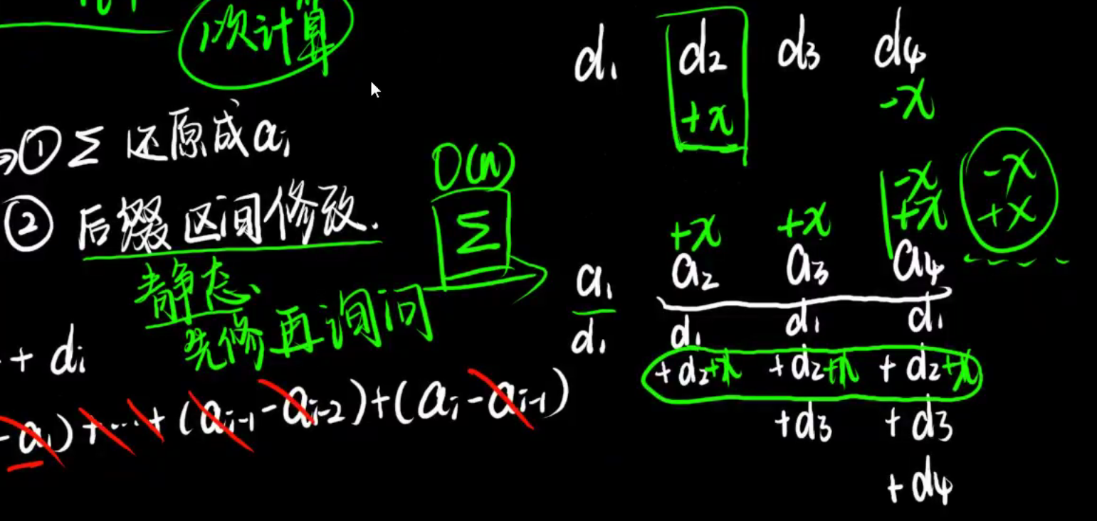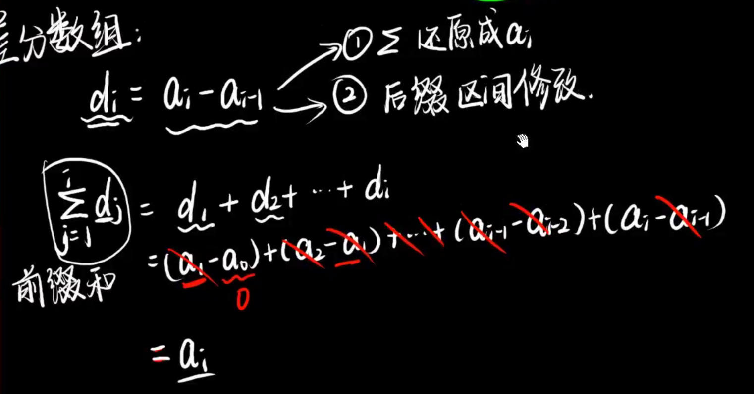 1.还原成a[i]:对差分数组进行前缀和能还原出a[i]。