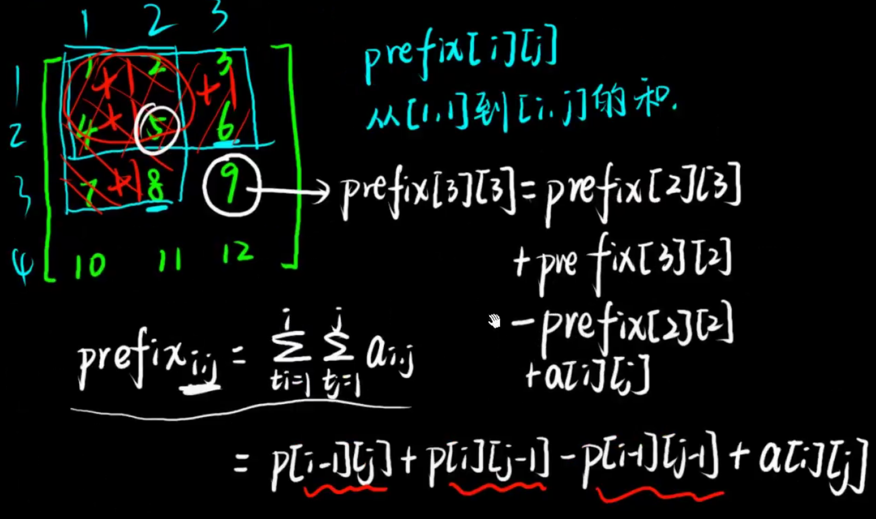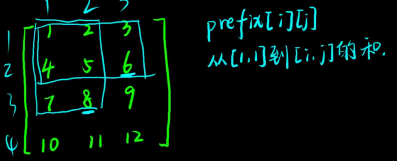 在二维前缀和中,pre[i][j]表示从[ 1,1 ]到[ i , j ] 的矩形中所有元素的和。