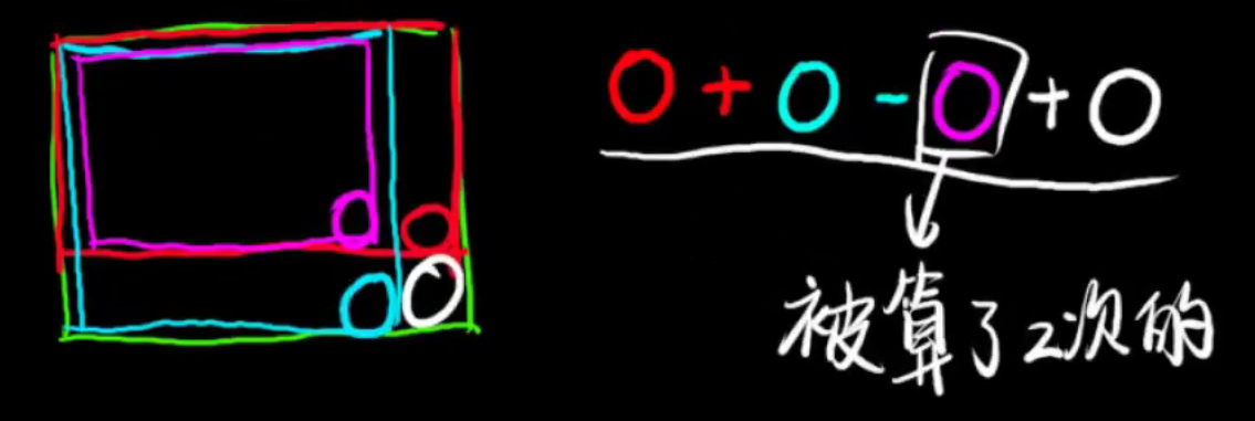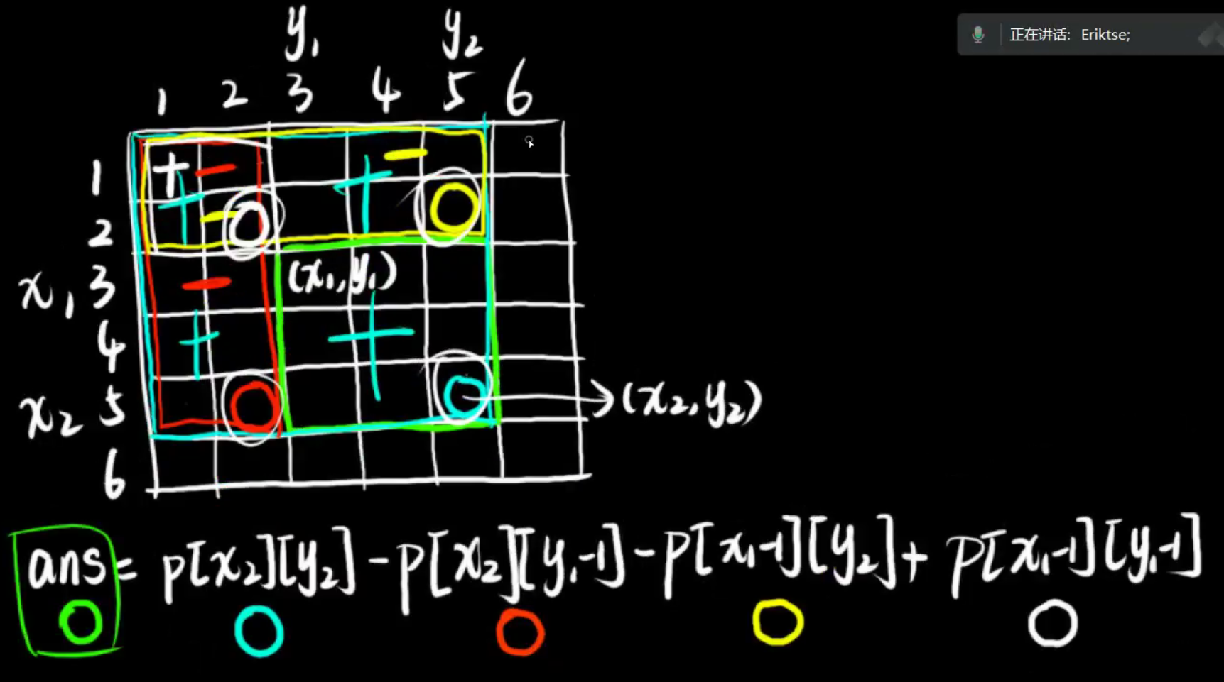 ll ans = pre[x2][y2] - pre[x1 - 1][y2] - pre[x2][y1 - 1] + pre[x1 - 1][y1 - 1];