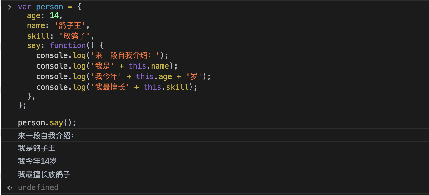 say函数作为对象下的方法,在被调用后,其 this 指向的是他所在的对象,在这里就是 person 对象。