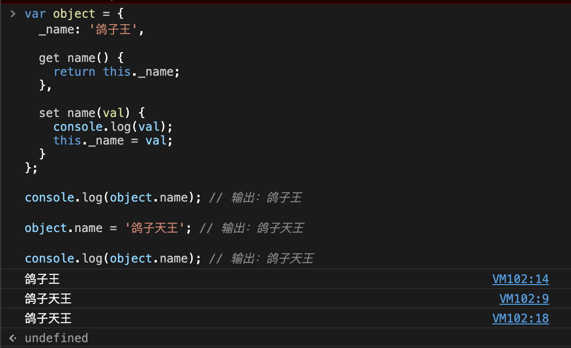 getter 和 setter 本质上也可以理解成两个函数,作为对象下的函数,在调用的时候 this 也会指向该对象。