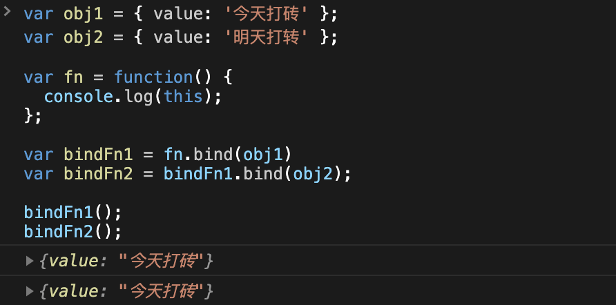 可以看到 bindFn1 被绑定了 obj1 作为 this,之后不论怎么操作,他的 this 都会是 obj1。