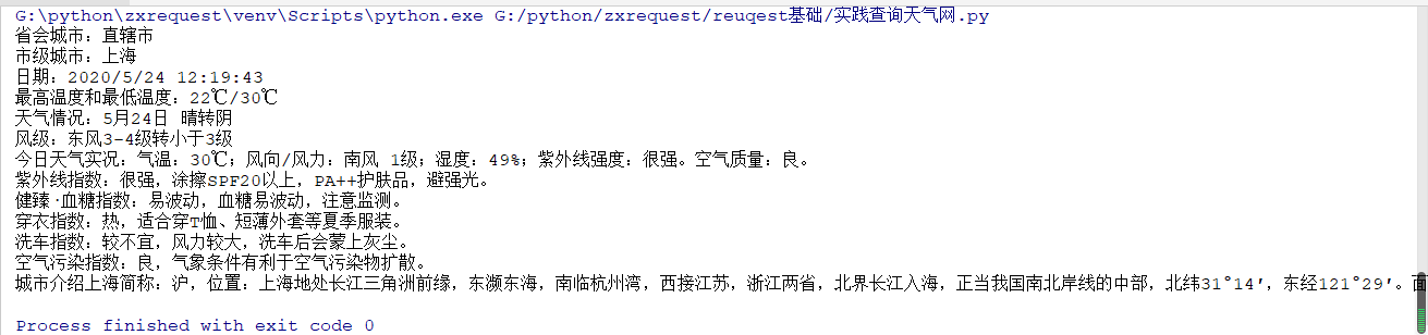 from urllib import parse import requests,xmltodict,json url="http://www.webxml.com.cn/WebServices/WeatherWebService.asmx/getWeatherbyCityName" city={"theCityName":"上海"} headr={"User-Agent":"Mozilla/5.0 (Windows NT 10.0; WOW64) AppleWebKit/537.36 (KHTML, like Gecko) Chrome/63.0.3239.132 Safari/537.36"} ctityl=parse.urlencode(city).encode('utf-8')#设置提交数据的编码格式为utf-8,有用到urllib库 # r=requests.get(url,params=ctityl,headers=headr) prox={"http":"http://36.7.26.113:4216"} r=requests.get(url,params=ctityl,headers=headr,proxies=prox)#使用代理服务器进行爬虫 r.encoding='utf-8'#将返回的数据转换为utf-8 o = xmltodict.parse(r.text)# parse是的xml解析器 sjson=json.dumps(o,ensure_ascii=False,indent=1)# dumps()方法的indent=1,格式化json # json库dumps()是将dict转化成json格式,loads()是将json转化成dict格式。 data=eval(sjson)#转换为dict数据 # print(sjson) print("省会城市:"+data['ArrayOfString']['string'][0]) print("市级城市:"+data['ArrayOfString']['string'][1]) print("日期:"+data['ArrayOfString']['string'][4]) print("最高温度和最低温度:"+data['ArrayOfString']['string'][5]) print("天气情况:"+data['ArrayOfString']['string'][6]) print("风级:"+data['ArrayOfString']['string'][7]) print(data['ArrayOfString']['string'][10]) print(data['ArrayOfString']['string'][11]) print("城市介绍"+data['ArrayOfString']['string'][-1]) # 知识拓展: # xmltodict库的unparse()json转xml # 参数pretty 是格式化xml # xml_str = xmltodict.unparse(data, pretty=1)