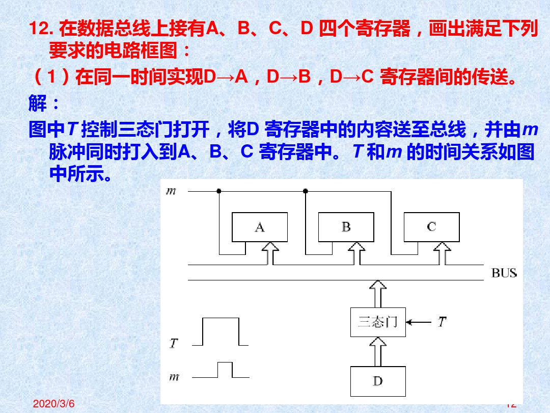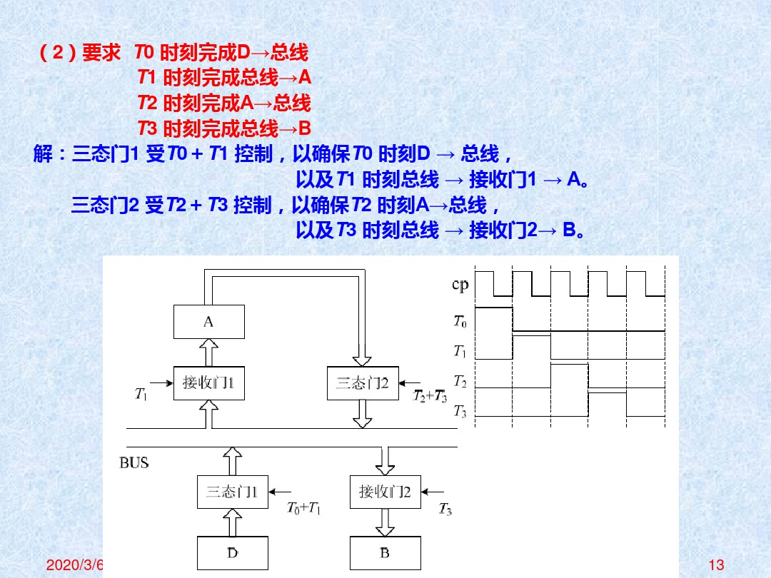 为了减轻总线负载,总线上的部件应通过三态驱动缓冲电路与总线连通,由三态门的控制端控制什么时刻由哪个寄存器输出。当控制端无效时,寄存器和总线之间呈高阻状态。
