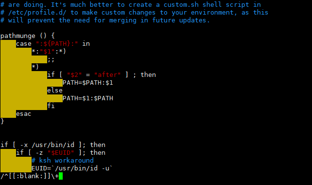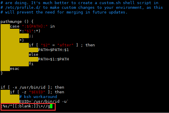 用 vim /tmp/profile 命令进入该文件 并搜索 /^[[:blank:]]\+