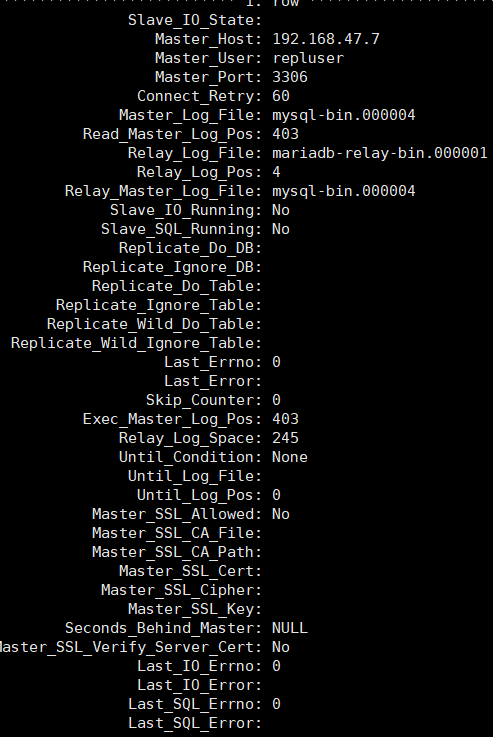 MariaDB [(none)]> grant replication slave on *.* to 'repluser'@' 192.168.47.%' identified by 'centos';