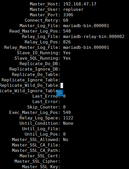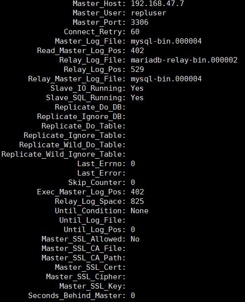 MariaDB [(none)]> grant replication slave on *.* to repluser@'192.168.47.%' identified by 'centos';