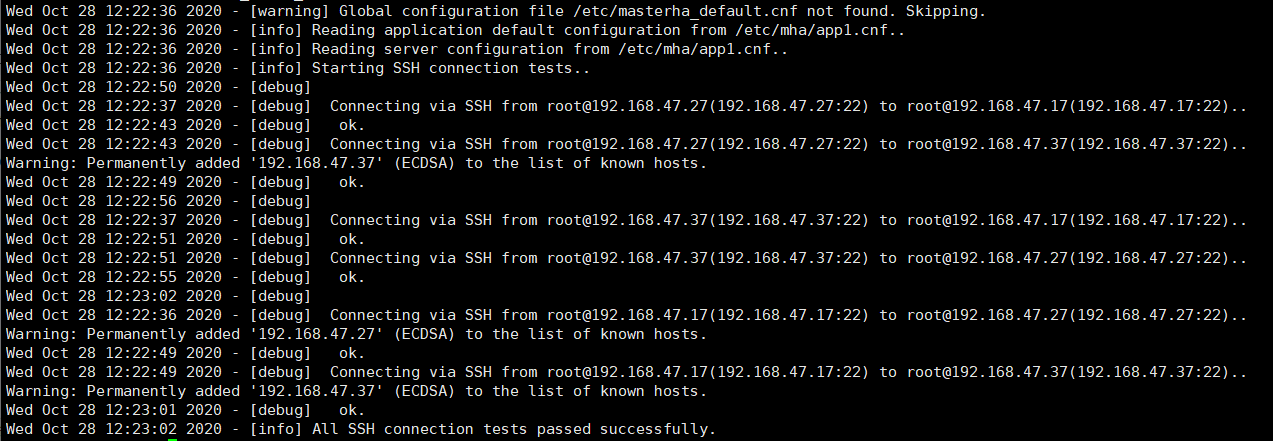 [root@centos7 ~]# masterha_check_ssh --conf=/etc/mha/app1.cnf 检查ssh配置