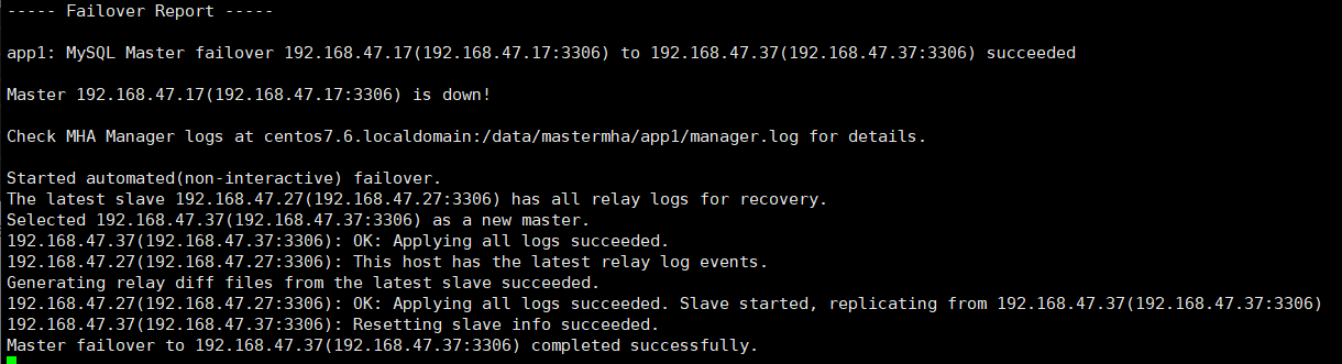 [root@centos7 ~]# tail -f /data/mastermha/app1/manager.log 可查看日志