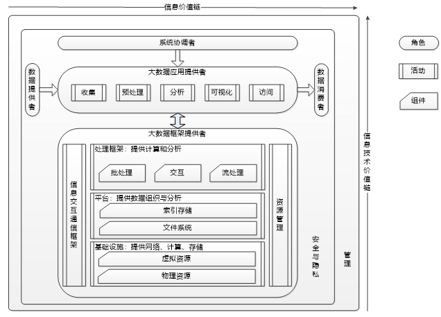 大数据参考框架提出了大数据系统中信息流向、系统活动、系统组件、角色关系,指出了完整的大数据系统应该包括大数据平台框架以及大数据应用。同时明确了安全和隐私、管理需要覆盖硬件、软件和上层应用。